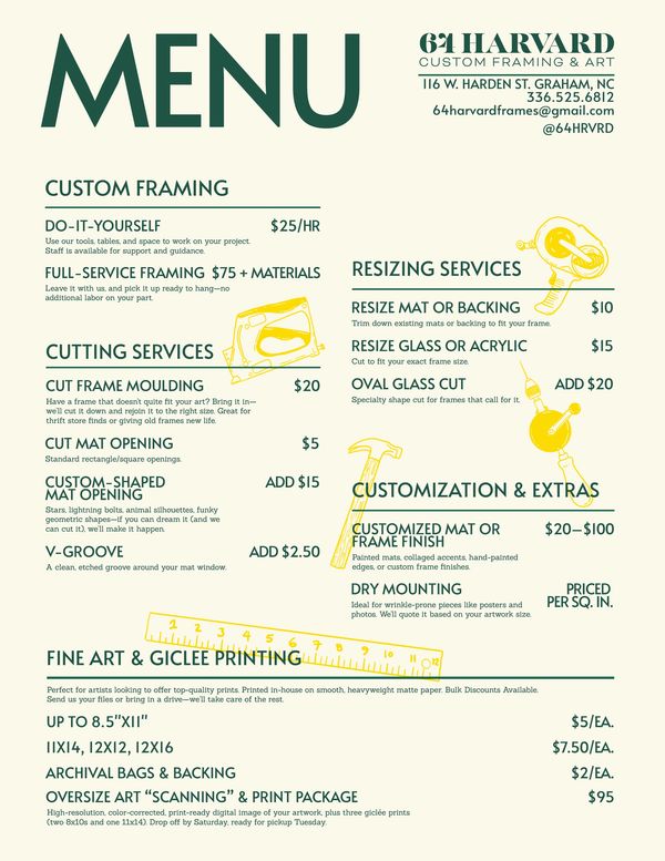 64 Harvard is a funky little frame shop in downtown Graham. We bring an exciting creative perspective to the methods and standards of a traditional frame shop, resulting in a truly custom product.